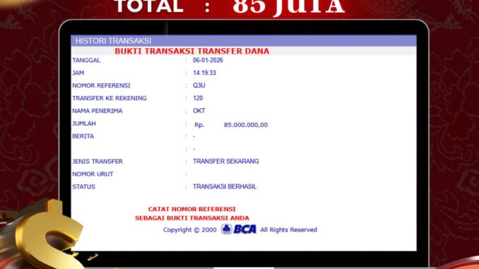 NAGA303 mengucapkan selamat kepada user id : PIN*** yang telah berhasil mendapatkan jackpot pada permainan LIVE CASINO DI DUEL DICE. Kemenangan sebesar Rp 85.000.000,-. telah dibayarkan LUNAS oleh pihak naga303 kepada pemilik user id setelah yang bersangkutan mengisi formulir withdraw. Proses pencairan dana berlangsung sangat cepat hanya dalam waktu 6-11 menit sudah berada dalam rekening pemilik user id. Bukti transfer yang dapat anda lihat adalah bukti SAH / VALID yang langsung di dapatkan melalui bukti transaksi dari Bank yang digunakan untuk pengiriman dana pada rekening pemilik user id. Terima kasih kami sampaikan kepada para pengguna setia naga303 yang telah menggunakan situs kami, sebagai Bandar Terpercaya yang pastinya membayar semua kemenangan member hingga lunas. Apakah Naga303 PENIPU ? Reputasi “NAGA303 TERPERCAYA” sudah sangat melekat. puluhan hingga ratusan ribu pengguna setia NAGA303 tetap menggunakan situs terbesar dan terbaik di Indonesia ini. Hapus rasa was-was dan khawatir anda, kemenangan anda berapapun PASTI dibayarkan hingga lunas.